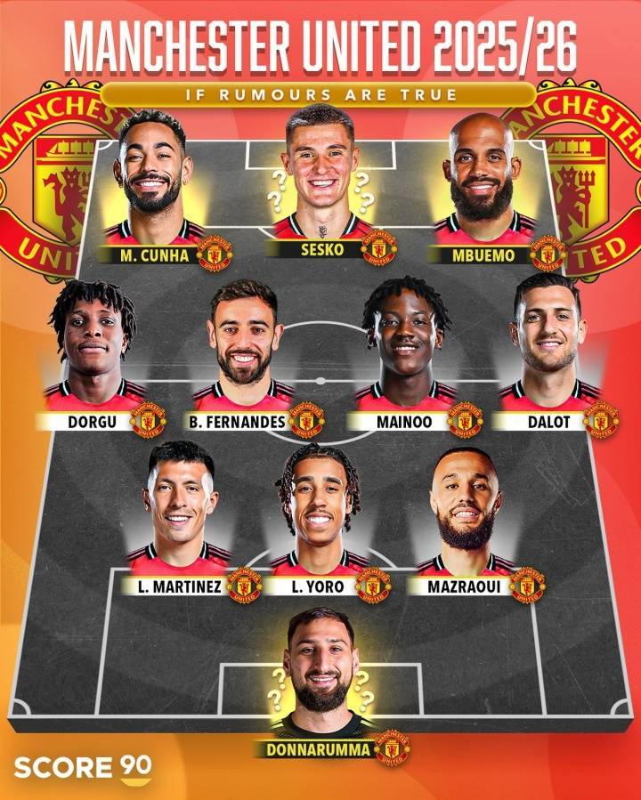 直播吧08月01日讯 据多家媒体报道,曼联正在追求莱比锡前锋塞斯科和巴黎门将多纳鲁马,外媒SCORE90根据转会传闻,制作了新赛季曼联的潜在首发阵容。